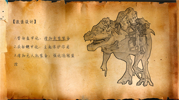 “X科技研究所成立之初,便对军事武器的结合有着浓厚的兴趣。在这样的目标驱使下,鳄龙应运而生。它有着粗壮的后肢和短翘的前腿,人们常常惊讶于它的奔跑速度。鳄龙作战时,能操控无人机配合作战,对敌人做出毁灭性的打击。”
