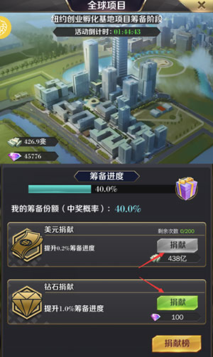 全球项目可由会长或者副会长开启,项目开启后就是拼手速的时候了,美金捐献每次可获得50贡献,捐献上限200次,钻石捐献每次可获得250贡献,捐献上限40次(一般没人参与钻石捐献)。当捐献进度达到100%,则自动开启BOSS谈判,每人有3次免费谈判机会,可通过钻石额外购买3次机会,每次谈判过后根据造成的伤害获得对应的贡献奖励。
