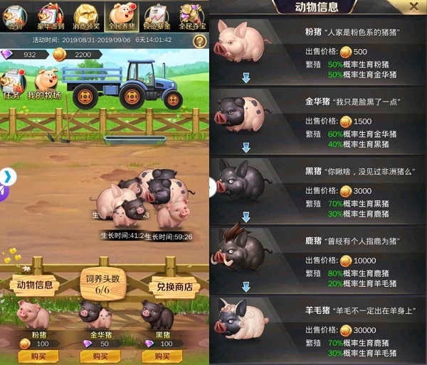 玩法大概就是买小猪,生长成大猪,然后选择繁殖或者卖出,生长和繁殖有CD,繁殖有一定概率进阶高级猪。