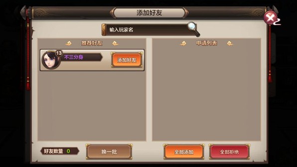 点击好友界面下方添加好友按钮,就可以开始添加/拒绝添加好友。玩家可以选择添加系统推荐好友,或直接输入玩家姓名添加。