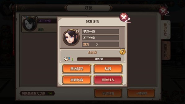 在好友界面中,玩家可以选择与好友私聊,赠送/领取耐力,或点击好友头像后选择向好友赠送鲜花、私聊、查看好友阵容,也可选择删除好友、查看与好友间的好友度等。