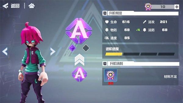进入参赛者页面,点击角色左侧稀有度旁的黄色箭头,即可进入角色进阶界面。每一次进阶还分4个进度,可见这个升阶过程也并不容易,是一个长期积累的过程,最好办个月卡,每日的任务,免费礼包也不能忘了。注意集中资源进阶单个角色,不要分散,当然如果你资源多那也无所谓了。
