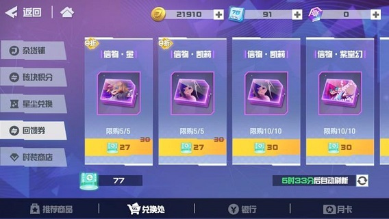 对了,在商店兑换处的回馈券兑换中,也可以利用回馈券来购买相应角色的信物和信任徽章,每隔一段时间会自动刷新,注意时不时点开查看。