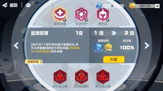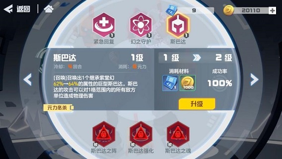 技能方面,专属技能【紧急恢复】可以对1个敌方单位进行普通攻击并且为生命值最低的右方单位回复攻击力一定百分比的生命值,非常给力的技能!5费的元力技能【幻之守护】可以提升3格范围内的所有右方双攻,持续2回合,虽然费用有点高,但先手开带来的收益还是可观的。元力必杀【斯巴达】,8费,召唤继承本体一定百分比属性的巨型斯巴达,斯巴达可以对1格范围内的所有敌方单位造成物理伤害。