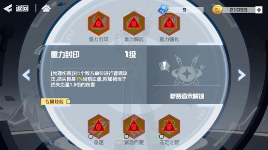 专属技能【重力封印】对单体普攻物理伤害,损血1%(1级)附加相当于损失血量1.8倍的伤害。
