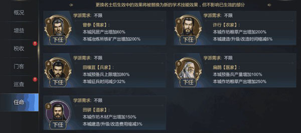 任命:主君们可以在所拥有的主城、分城分别任命5名名士对任命城池增加增益效果,下任名士需要8小时等待时长才可更换新一名名士。