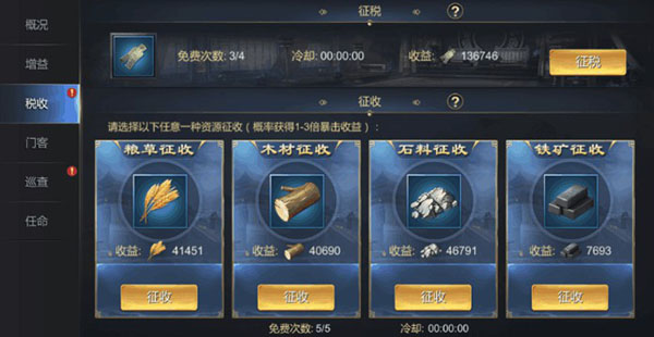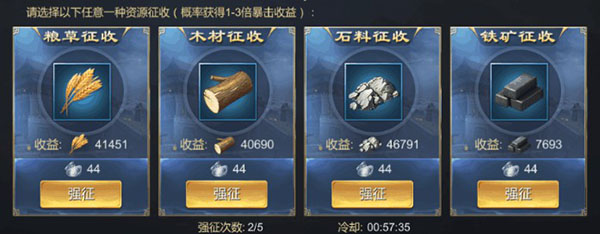 税收:可以进行5种资源征收,刀币征收4次,4类基础资源征收量由相应的资源地的产出和都府等级决定。普通征收固定为5次,每次征收都有1小时冷却需先加速使冷却清0,才可再次征收,若普通征收5次之后则更换为强征,强征次数每日固定为5次,强征时也可使用元宝进行加速直接获取资源,但使用的元宝是双倍消耗且强征会扣除声望切记。