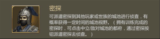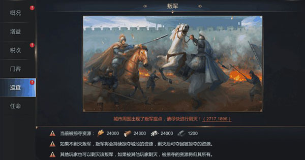 巡查:武将巡查可以提高本城治安值,每次巡查武将可以最多选取5名,巡查消耗若干刀币,巡查武将的武力值越高则提升的治安值越多;巡查武将的谋略值越高则大概率发现叛军,发现叛军并击杀之后可以获得被叛军掠夺的所有资源。