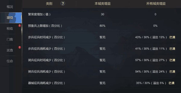 增益:分为本城类增益和所有城类增益。部分增益效果有上限值,溢出则不计算在内。