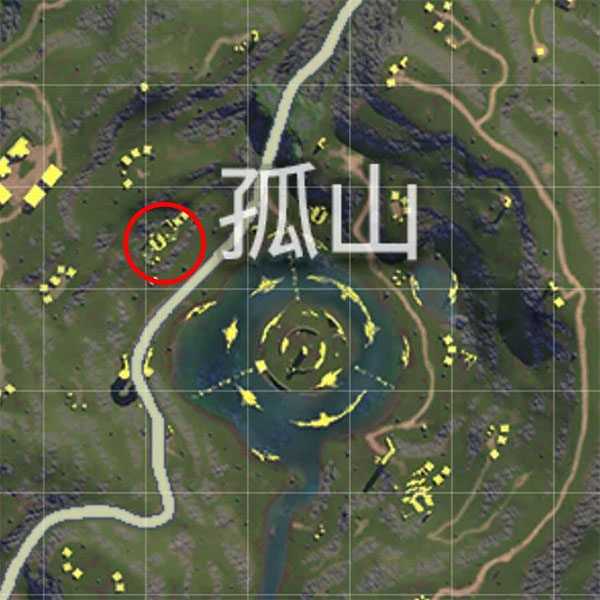 孤山这个地点,从整体上来看是开阔平坦的特点,有一些小掩体环绕,资源分布也是相当有特色的,中央位置有着格外丰富的物资,而四周帐篷群只有一些基础资源。因此我们在选择落点时,需要避开高风险区域,而如上图所示的这个帐篷群就是一个不错的落点,位于左上方,离中心没那么近,可以刷新出量子魔方、药品等物资。