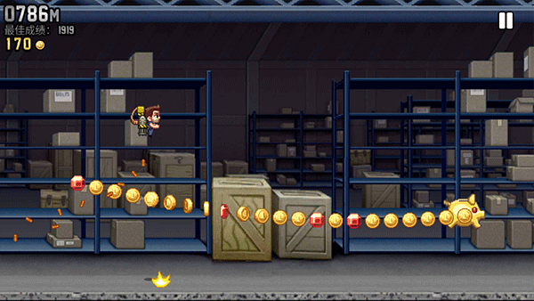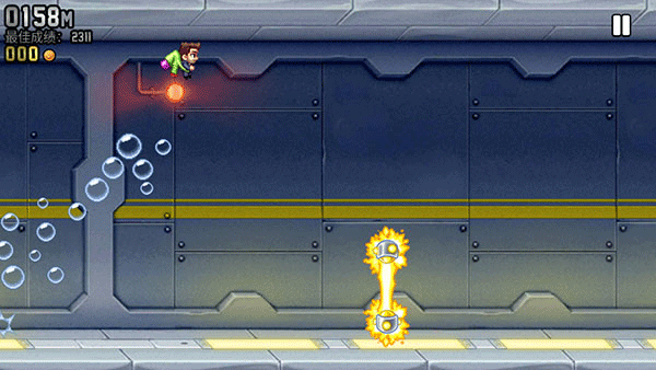 游戏中人物一直处于向前飞行的状态,我们不能控制人物的进退,只能够控制上下方向。人物在不断的奔跑中,还需要躲避导弹、激光器以及电激光链(后期小编会对这些道具一一介绍)如果,被上面三个武器碰到,那么游戏也就结束。而疯狂喷气机游戏中还会出现很多有益的道具,比如飞鸟、喷火龙、机甲等。