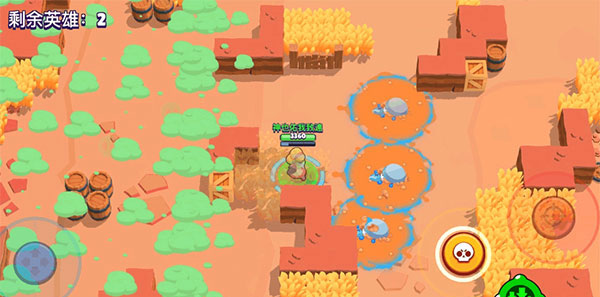 荒野决斗是单人或双人战斗模式,每局10名玩家,最终赢家只有一位/一组。通过摧毁木箱或击杀敌人获取能量块,提升攻击力和生命值,毒雾会不断从外向内包围,英雄身处不断缩小的安全区域中,淘汰其他玩家,生存排名越高则奖励越丰富。