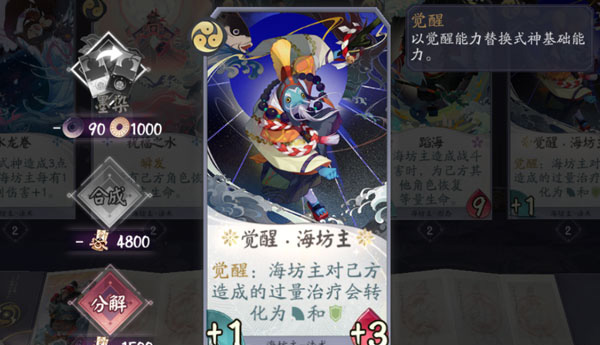 海坊主是一个以治疗增益为主的式神,他强大的回血能力以及对护甲的转化不但对式神有着不错的保护作用,对于牌手自身的安全也是一个很大的保障,配合萤草可以贡献出成吨的“奶量”。海坊主觉醒后还可以把过量的治疗转成护甲的同时转化成力量,对于队伍的增益巨大。