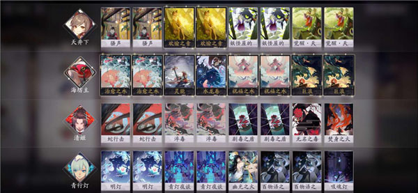天井下、海坊主、青行灯与兵俑,构筑成第一套卡组。天井下可以提升护甲的获取,还可以制造“妖怪屋”协助站场,并提供过牌辅助;青行灯同样有过牌能力,还可以打出高爆发法术伤害;海坊主可以缓和伤害,施放群体攻击,其觉醒状态配合形态牌来给队友更好的发育空间;兵俑是站场及为友方式神叠加护甲的辅助,还能提供生命值。