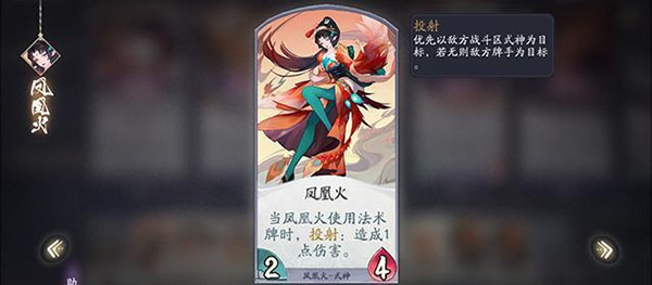 还有别忘了凤凰火的被动,每次使用她的法术牌都会进行投射1,可以对敌方战斗区式神造成伤害。如果你的凤凰火还装备了焚羽,就会变成投射2,所以计算伤害的时候千万不要把她的被动给忘了。