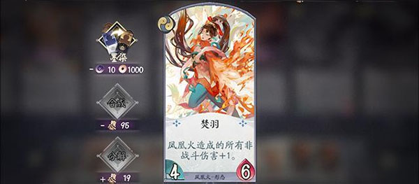 如果对面给你的压力不大,凤凰火的牌最好是留到2勾再进行爆发,因为2勾可以使用形态牌焚羽,让凤凰火的输出能力大幅提升,这就意味着当你使用瑞翔的时候,可以对准备区的式神造成2点伤害,对战斗区的式神造成4点伤害(算入凤凰火被动投射2)!