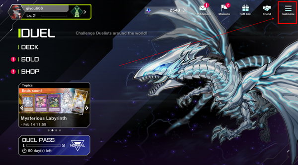 1、打开游戏王决斗大师,进入游戏之后点击右上角Submenu;