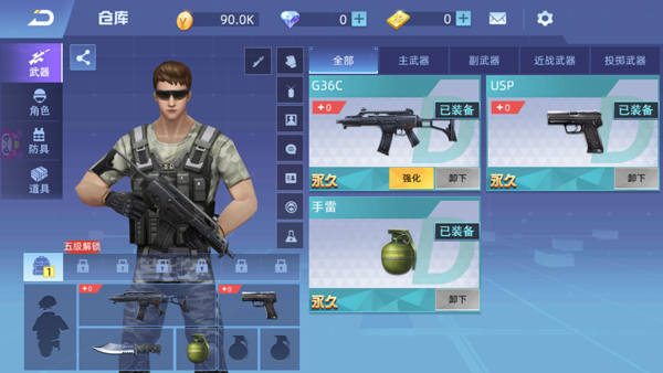 6、商城,可以通过积累的金币或钻石购买武器,购买武器可以通过对比看哪种武器基础属性,弹匣最厉害,还有角色,道具可以购买选择。