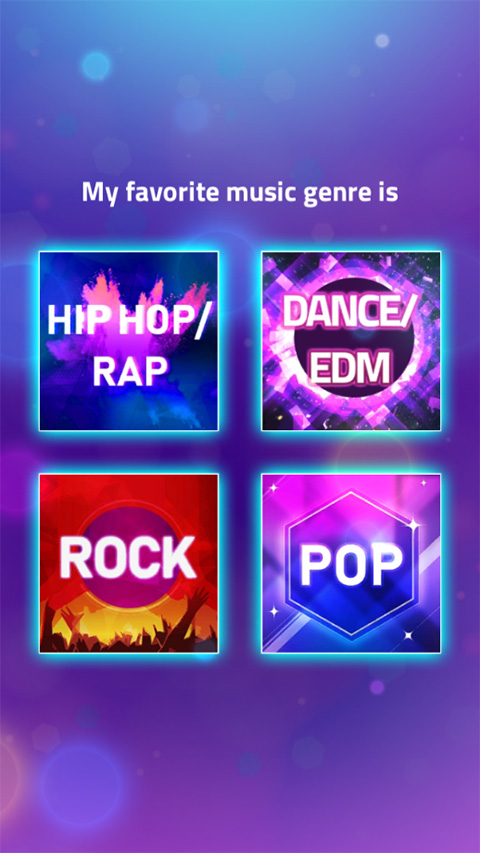 1、选择一首歌曲开始,界面会出现四个赛道,每个赛道会随歌曲的乐谱出现黑色的钢琴键,从上向下移动,点击钢琴键就会发出音符的声音,连续点击成功,音乐就会流畅的播放出来。
