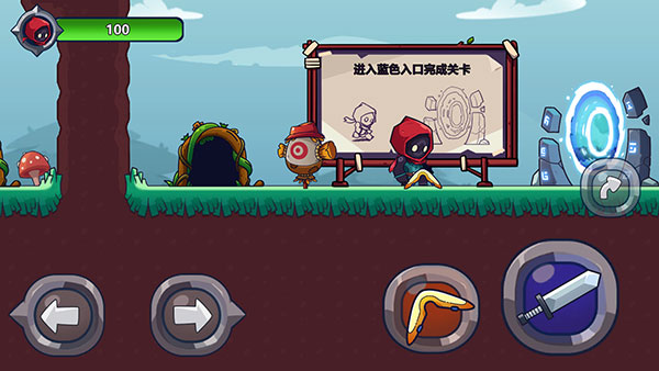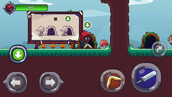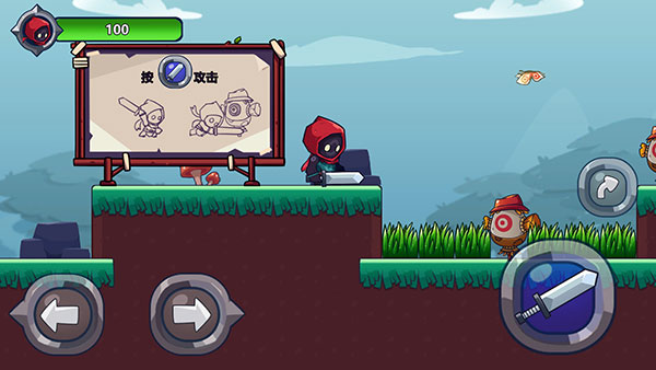 3、右下角的剑按钮是攻击键,是近战攻击的绝佳武器,可以用稻草人试试威力;