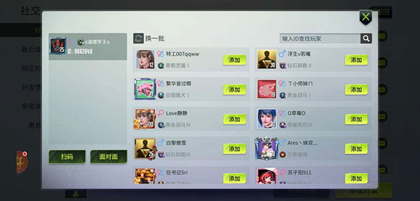3、扫码就是对好友的游戏二维码直接扫描就可以直接加好友的;面对面就与微信中的面对面建群一个类型的,输入相同的数字就可以添加好友的;输入玩家ID是与其他的游戏一样,用玩家ID就可以添加好友;最后一种就是添加好友界面中会出现一些随机好友,玩家可以自己选择想要想添加的好友。