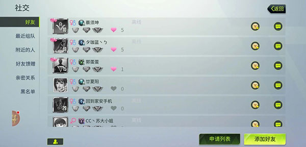 1、玩家成功登陆游戏,在游戏界面的左侧会有组队、好友的菜单栏的。点击好友按钮进入好友社交界面,会出现好友、最近组队、附近的人、好友馈赠、亲密关系、黑名单等详细好友详情栏,这些与一般的游戏都是一样的。