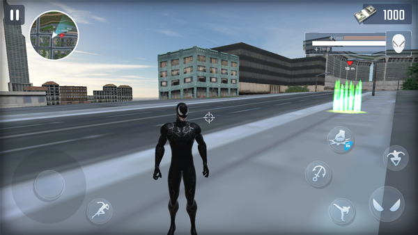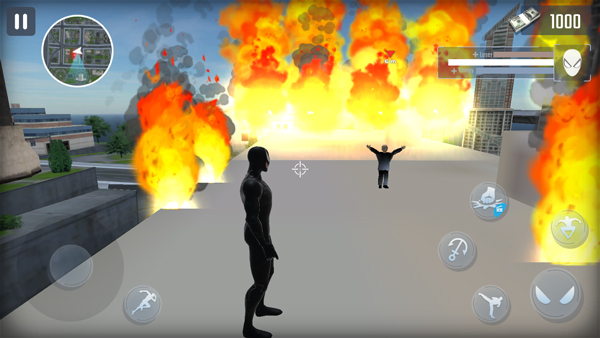 操作简单易上手,采用横版模式,左边控制方向,右边负责攻击和技能。游戏中的纽约城市风格类似迈阿密或拉斯维加斯,玩家可以在开放世界中自由飞荡,利用各种建筑物作为武器进行战斗。游戏还有第三人称视角的黑帮模拟器玩法,让玩家体验超级英雄或忍者绳索英雄的不同魅力。