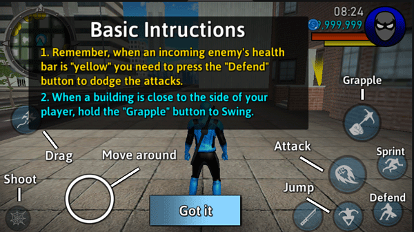 游戏特色包括第三人称视角的打斗场景、灵活的操作方式以及多样化的技能系统。玩家需要利用蛛网发射、蜘蛛飞荡等技能在城市中快速移动并击败敌人。此外,游戏还提供了一个更大的曼哈顿3D开放世界供玩家探索,完成任务可以获得金币和装备升级。