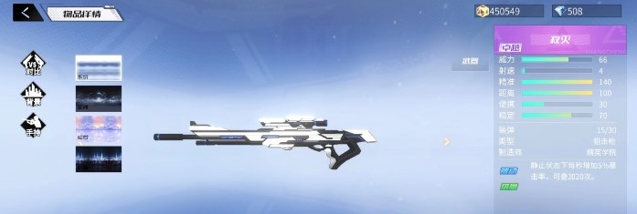 寂灭是一把卓越级狙击枪,白色的枪托点缀着一点蓝色,整体很有机械感。单从基础面板数值上这把武器并不优秀,稳定性和威力都比较差。