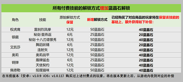 除了技能风格的氪金调整,技能获取方式也有所调整,原价6元或12元解锁的技能,将调整为消耗25或50蓝晶石解锁,同样对已购买的玩家补偿额外的20或者40蓝晶石。