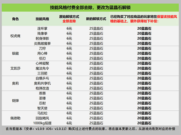 譬如原来每个风格需要6元解锁,将改成消耗25蓝晶石解锁,对已经购买的了对应商品的玩家,将在保留技该技能风格的基础上,额外补偿20蓝晶石。