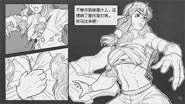 ◆这是开场剧情,至于说的是什么故事,在这没有详细说明,需要玩家在游戏中另行探索,但大致意思是莫名其妙的来到这个地方,然后莫名其妙的被划破衣服,然后一顿完全体展示暴打来犯之敌,反正大致过场就是这样,虽然故事介绍的有点不详细,但从这种铅笔画来看,人物细节描绘的很不错,阴影表现,面部表情,包括手指和肌肉纹路等,只不过看起来有点港漫既视感;