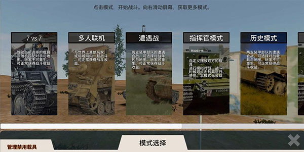 遭遇战:俩支装甲部队的遭遇会战。可选择对战年代与地图,玩家可重生,可正常获得战斗收益;