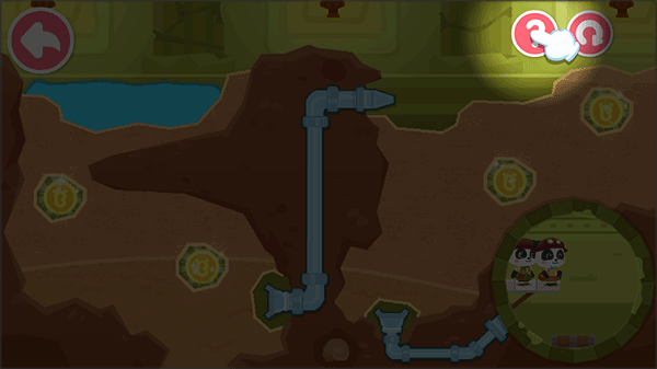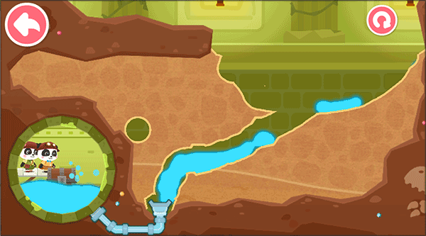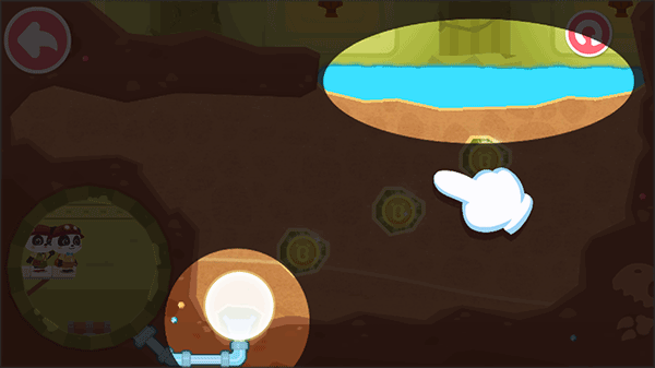 规划水流路径,利用水的浮力,让宝箱浮上来!挖掘土块,控制水的方向。前方有障碍物,注意躲避。这一环节的设计,不但考验了宝宝的应变能力,还将测一测宝宝的空间布局能力。