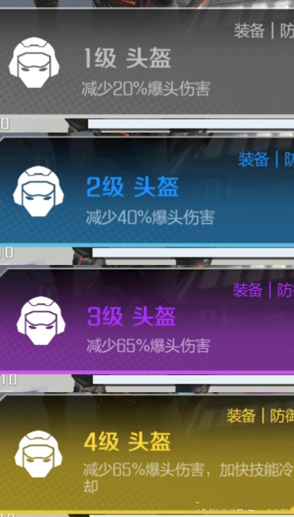 头盔作为保护头部重要的防具,等级越高的头盔防护性就越高,是避免被老六狙击手爆头带走必不可少的东西,头盔等级分为1级、2级、3级、4级等级越高防护性就越强