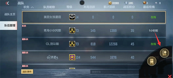 2、然后点击界面左侧的队伍管理,点击界面右下角的符号进入。