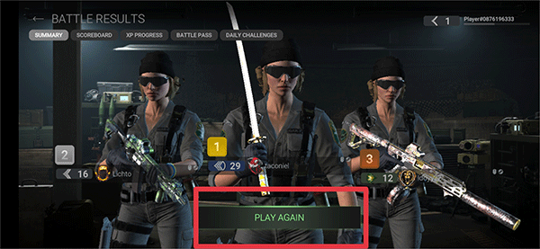 5、最后游戏结束后你还可以查看自己的战绩,若还想和队友再玩一局可以点击play again