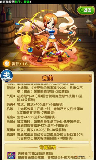 普攻不送怒还减怒宝物25以后就是减两怒,怒攻就是半个雷神了!随机3个人物外加30%的麻痹几率,还附加给全队加怒气!对于一个看脸的游戏!完全可以100%麻痹!还有就是她的进阶到7,还有女性光环效果,所有上阵女性伤害多加10%,不错哟!给罗宾提升输出力,可惜草帽只有两女的!(如果是走美女对,奈美可是核心队形哟)附带一张美女队的飞机票