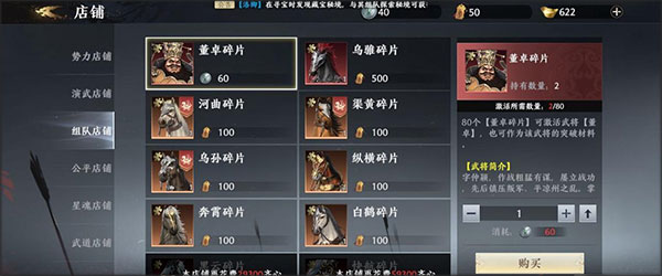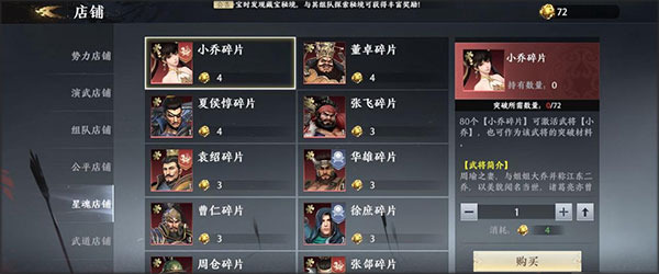 星魂店铺:抽卡核心商店,有耐心存孙坚就跟我一样每周十个买完,多余碎片偶尔补升阶,开区第一天想冲战力就重复的夏侯或者董卓升几阶,高阶要的碎片太多,不建议主换某个,补升阶为主。