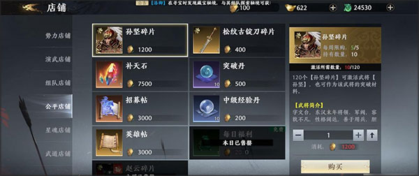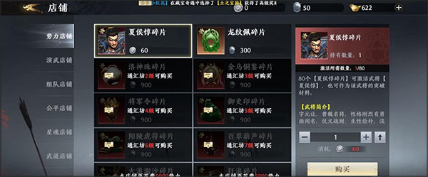 势力店铺:无脑换夏侯,法宝碎片补成品就行,可以存,花了也没事,后期比前期收益高。