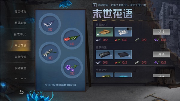 夏天的风将甜蜜的气息吹进明日大陆,艰险的生存环境也仿佛不那么面目可憎了。幸存者们勇敢地牵起彼此的手,在花语明灯的见证下,创造独家记忆。8月6日至8月18日在明日大陆完成指定任务,即可获得随机花朵碎片,而收集到一定数目的碎片,就能兑换到精美的道具。还不快让花香飘满末日世界!