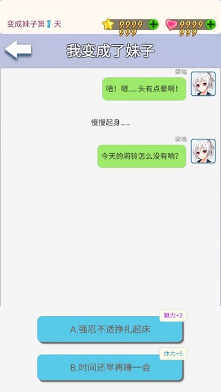 故事讲的就是一个外卖小哥与一个女孩互换身体,然后我们会有7天时间来进行剧情,每当体力小于50就会开启下一天,根据剧情我们可以得到魅力,情商,好感,知识的数值,等到7天后会根据数值来判断最后的结局,到底是适应现在的身体,还是回到自己原来的身体,这需要我们玩通后才能知道。更新日志