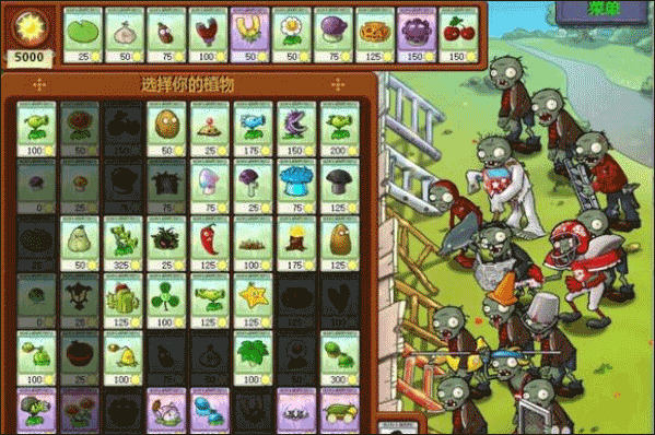 1、为了更快赚到金币,大家可以选择《谁笑到最后》这个模式,该模式的设定为:开局拥有5000阳光,且每过一波后获得250阳光、可以提前摆阵,植物无冷却,这样可以使阵容快速成型了,但不能选择向日葵、阳光蘑菇和免费的2种蘑菇。僵尸防御高的有铁桶、橄榄、铁珊门。大家可以按照小编下图植物选择,为了赚金币,缺一不可。
