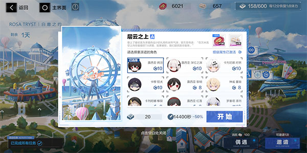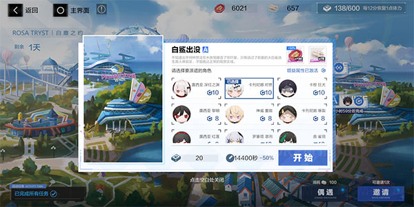 首先请玩家通过活动卡片进入白蘼之约界面,然后点击任意场地比如层云之上,再选择任意角色并点击开始,即可完成派遣。派遣需要消耗5~30点体力,体力每12分钟自然恢复1点,在派遣结束后(一般为1~8小时),即可获得晨星玫瑰。