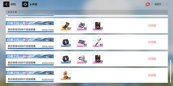 使用晨星玫瑰兑换奖励的办法很简单,点击白蘼之约界面左下角的活动任务,只要满足要求,即可领取包括黑卡、突破模组套件和角色狗粮在内的全部奖励,集满6000晨星玫瑰能获得橙色收音机收藏品哦!