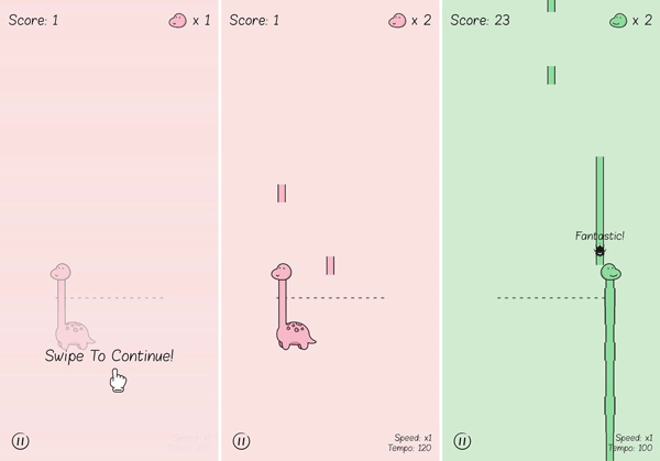 我们需要做的就是操纵小恐龙快速滑动,接住随音符掉落的色块,从而给小恐龙的脖子无限加长,诶,所以为什么游戏的设定不是一只长颈鹿呢?