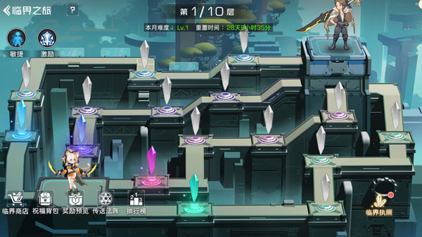 临界之旅是游戏的一个特色玩法,每月重置,通关难度随层数变化。共有10层,每层有4条路,挑战成功可解锁下一关卡。每条小路只能上阵特定职业的探员,而BOSS关卡无限制。玩法中还有随机增强的小怪和祝福系统,增加了游戏的挑战性和趣味性。