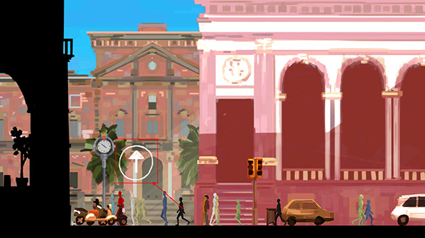 2、在开始剧情里,屏幕按住左下角就是向左走,按住右下角就是向右走,此时我们向左走进房子里并点击“爱心”,之后进入房子里,点击两次“时间钟表”;