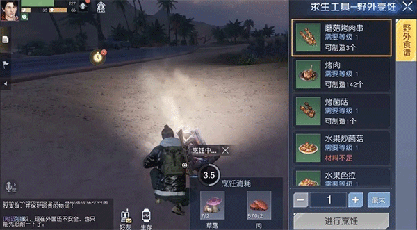 野外需要进食,背包里没有储存的食物了怎么办。别着急,野外求生工具,让你分分钟享受到“一天为盖地为庐,一把烤肉一壶酒”的潇洒肆意。玩家只需要点击求生工具中的野外烹饪选项,面前便会生起一团篝火,拿出你从大自然中采集来的新鲜食材,根据烹饪系统中的菜谱,放入相应的食材,不多时,专属于你的大世界美味就会呈现到你的面前。