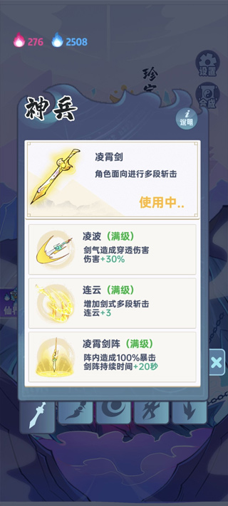 100%暴击的凌霄剑,让时空静止的日月金轮,伤敌于千里之外的千鸣弓等众多神兵养成